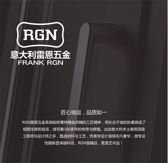 RGN五金系统始终以美学、安全环保的哲学理念设计产品,依托历久弥新的制造经验,力求提供最优质的门窗五金系统。正是这百余年来的积累和沉淀,造就了RGN品牌对于产品技术创新以及品质呈现的一贯苛求。将意大利美学理念与时尚元素注入产品设计,将极简魅力与潮流印记烙入品牌文化,RGN五金系统坚持让艺术触手可及,让用户享受体验,让生活更为高雅!